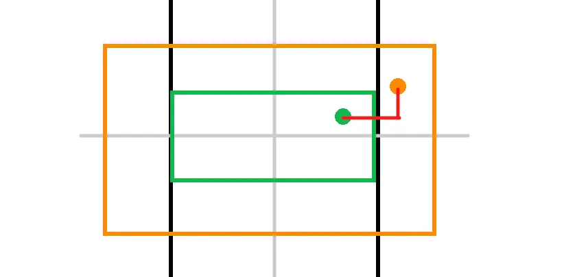 如上图,黑色是 View,灰色是 View 中线,绿色是原始图片,橙色是放大后图片。则图片中某个点在放大后相对于 View 的位置改变了。如果用户就是双击这地方放大的,我们希望它的位置保持不变。所以只要计算出橙点相对于绿点的位移就可以修正(相当于手动把放大后的图片往左下角平移,直到两点重合)。