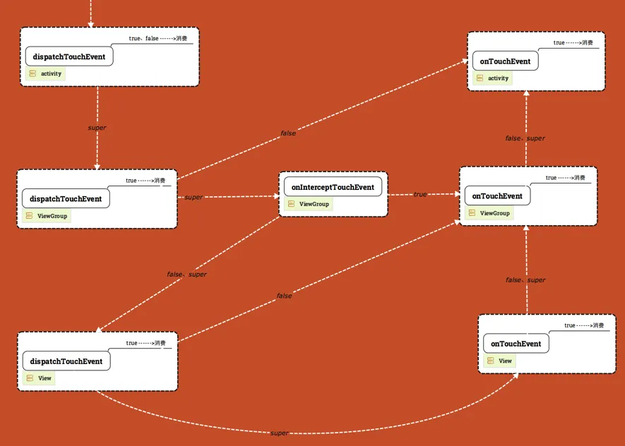 以左上角事件入口为例,首先 Activity 收到事件触发 dispatchTouchEvent,不论返回 true 还是 false 事件均终止,任何组件的任何函数均不会再被调用(包括 activity 自己的 onTouchEvent),只有 return super.dispatchTouchEvent() 也就是调用了 super 才会继续传递到下一级。