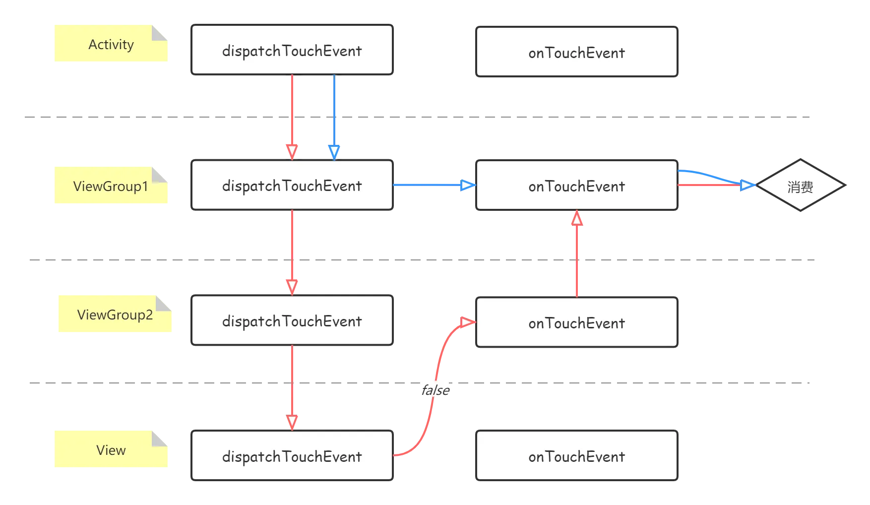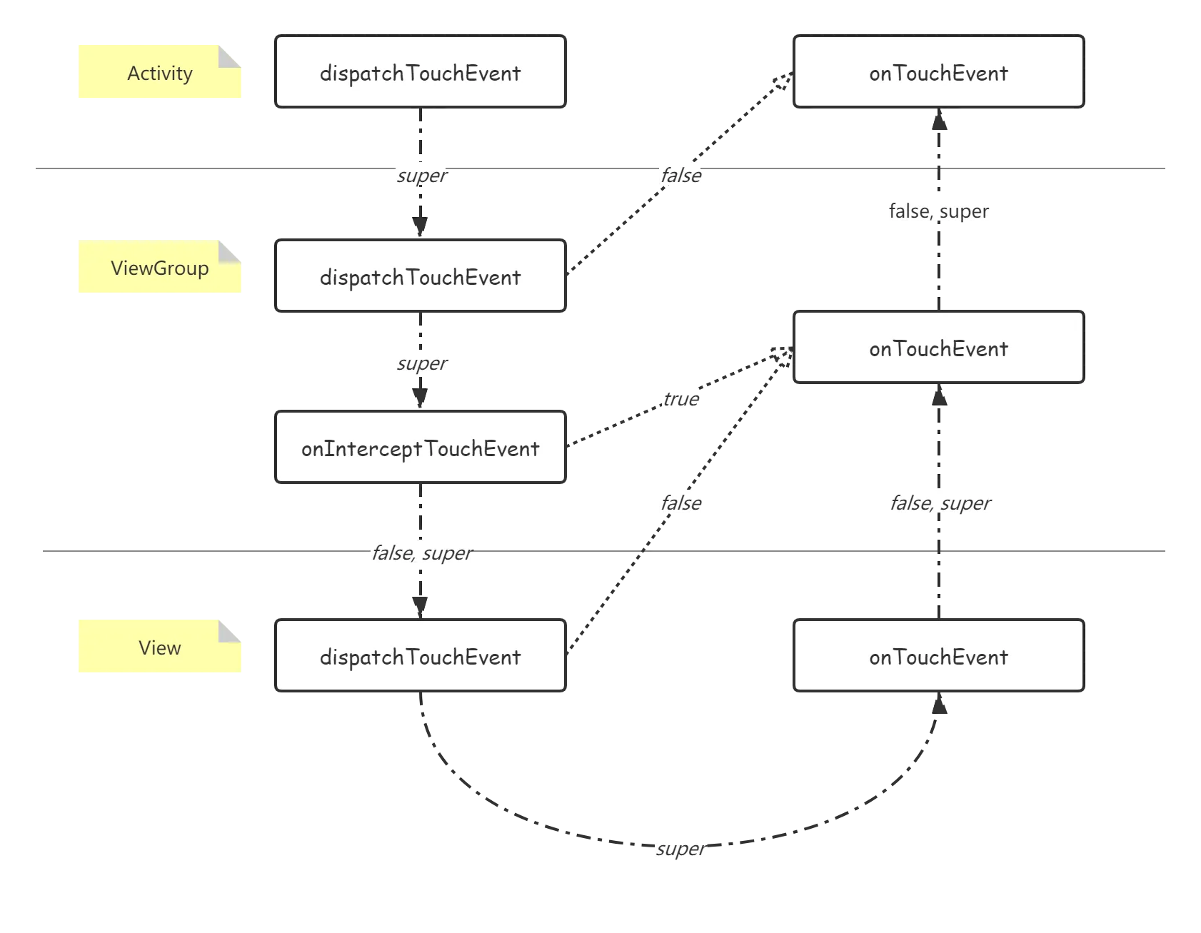 对于下一级 ViewGroup 的 dispatchTouchEvent 来讲,返回 true 同样消费事件立即终止传递。返回 false 则会回溯到上一层的 onTouchEvent。调用 super 则继续向下传递。