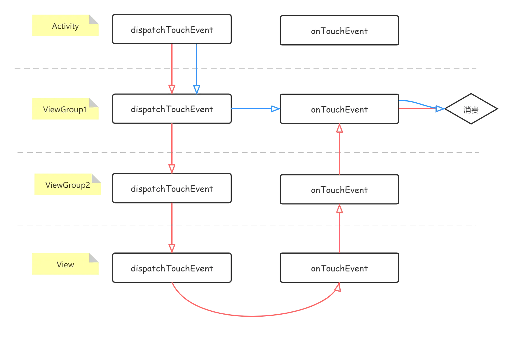 与 DOWN 事件不同,其他的都属于后续事件,默认情况下只有消费了先序事件(例如 DOWN)的控件才能收到后续事件,它的上层控件负责分派后续事件(有条件强行拦截)。这么说太抽象了,画个图看看(下图中红色表示 DOWN 事件,蓝色表示后续事件)