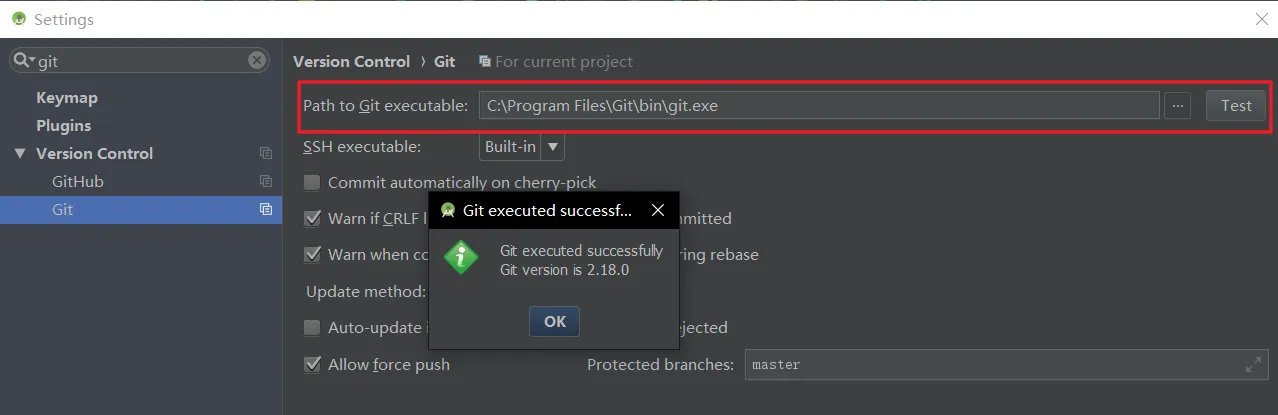 首先要确保计算机已经安装了 Git,之后 Android Studio 应该可以自动识别到 git 的位置。如果不放心可以打开设置搜索 git 可以手动配置位置并进行测试。