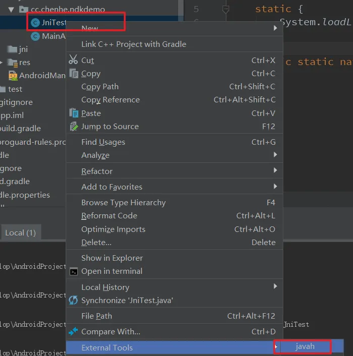 点击 OK 保存后就新建了一个工具。此时我们右击 JniTest.java,在菜单中选择 External Tools - javah 就可以快速生成头文件并放到 jni 目录。