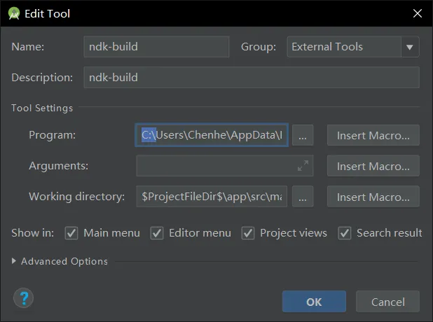 编译需要使用 ndk-build,其位于 ndk 目录下。如果要直接在命令行使用需要添加环境变量。类似的,为了方便我也添加了一个外部工具。