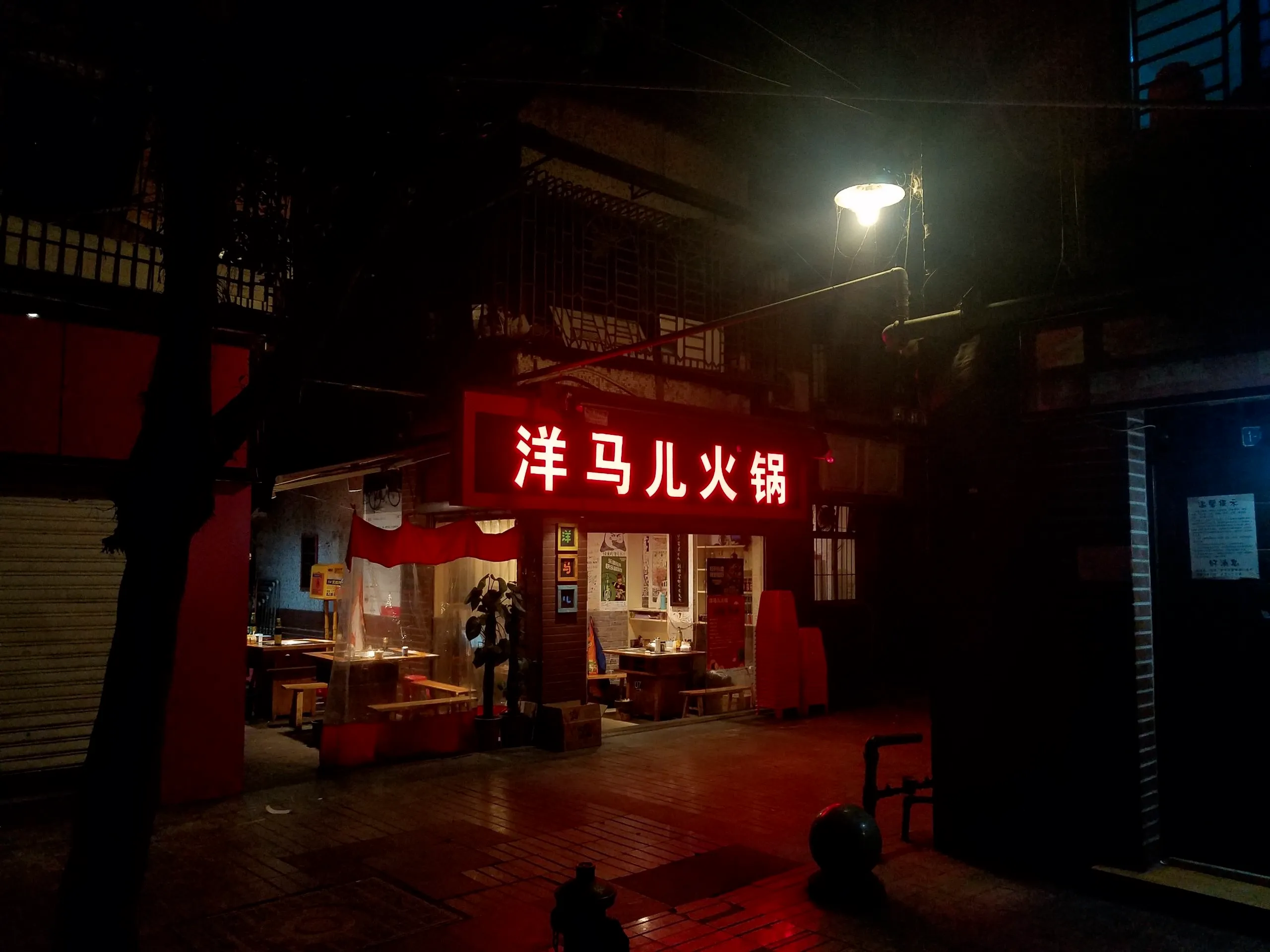 落脚后已经是夜晚了,今天没有安排什么行程,迫不及待地去品尝重庆老火锅。个人觉得吧,要吃地道美食,就要深入小巷。在各个点评网站搜寻了一番最后确定了一家洋马儿火锅(最后一天又去了另一家,不过还是推荐洋马儿)。这家店位于一个小区内,高德可以搜到。从解放碑附近完全可以步行到达。