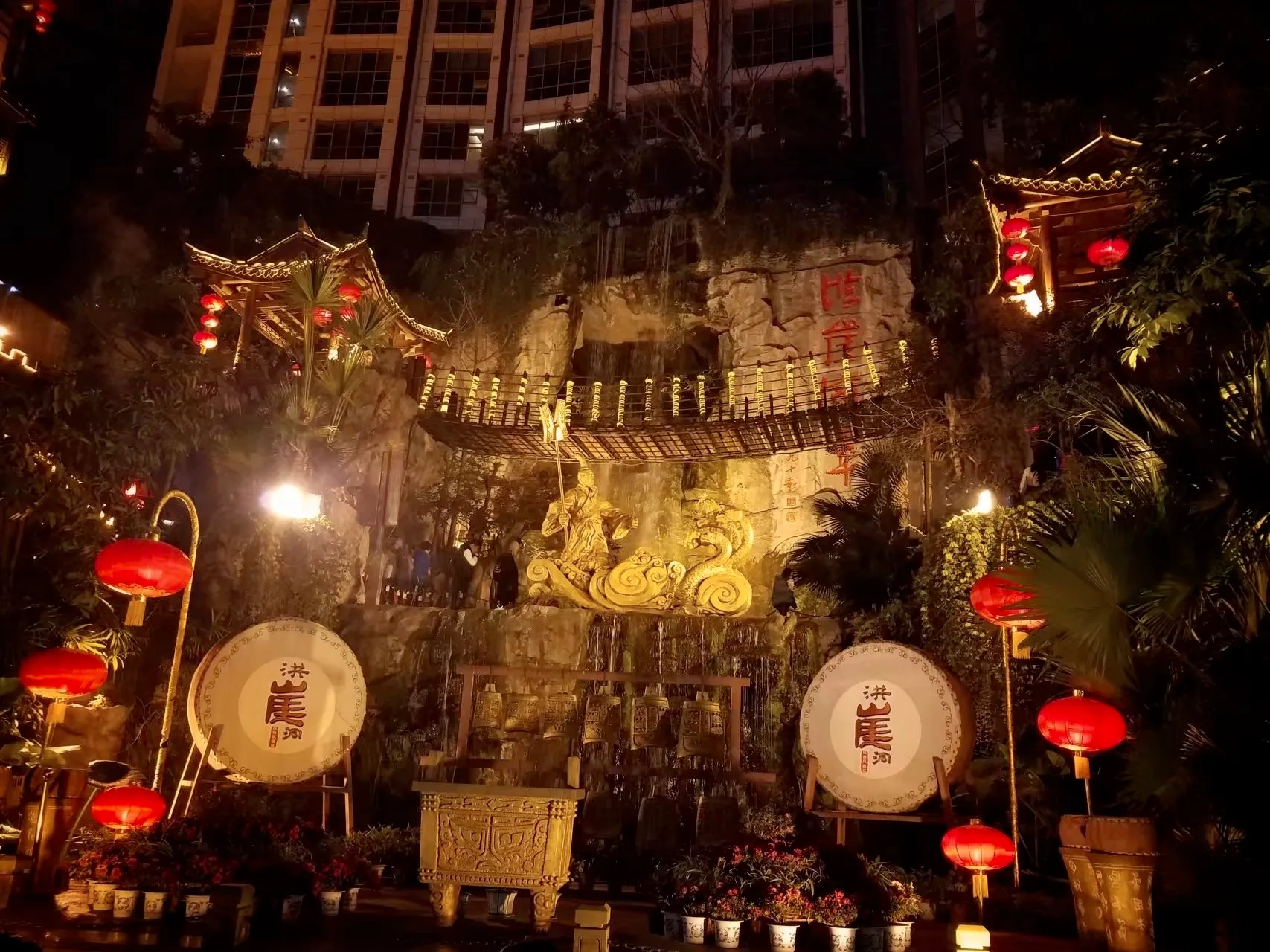 洪崖洞每一层商铺都有主题,也高端的也有大众化的,可以看牌子。4层是小吃街,是大多数人比较喜闻乐见的,可以在这解决晚饭。推荐从楼内逛,到1层之后,到最侧面(上图视角的最右边),这里是真正的洞。