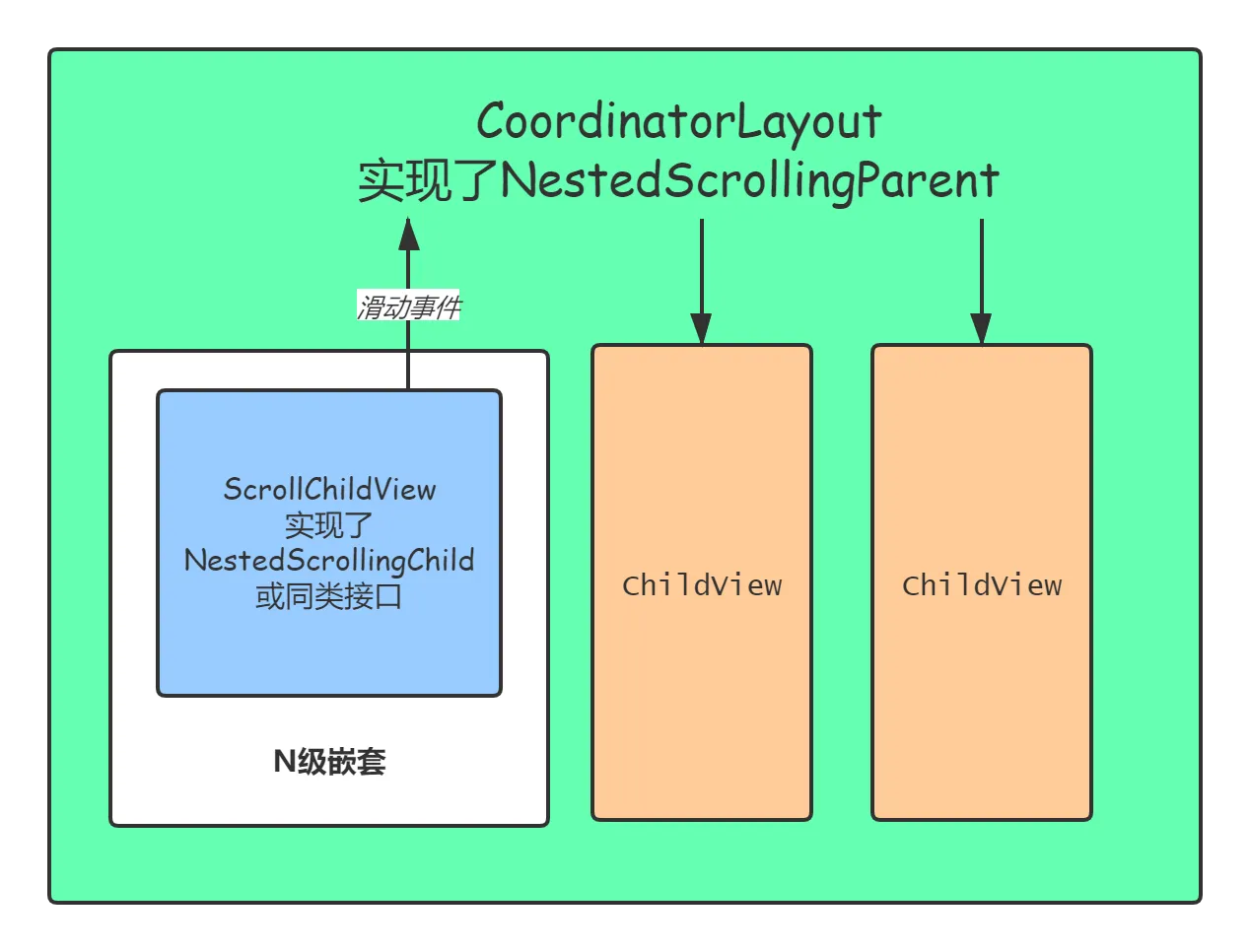 从 Android 5.0 (API21) 开始 Google 给出了官方解决方案 - NestingScroll,这是一个嵌套滑动机制,用于协调父/子控件对滑动事件的处理。他的基本思想就是,事件直接传到子控件,由子控件询问父控件是否需要滑动,父控件处理后给出已消耗的距离,子控件继续处理未消耗的距离。当子控件也滑到顶(底)时将剩余距离交给父控件处理。让我来生动地解释一下: