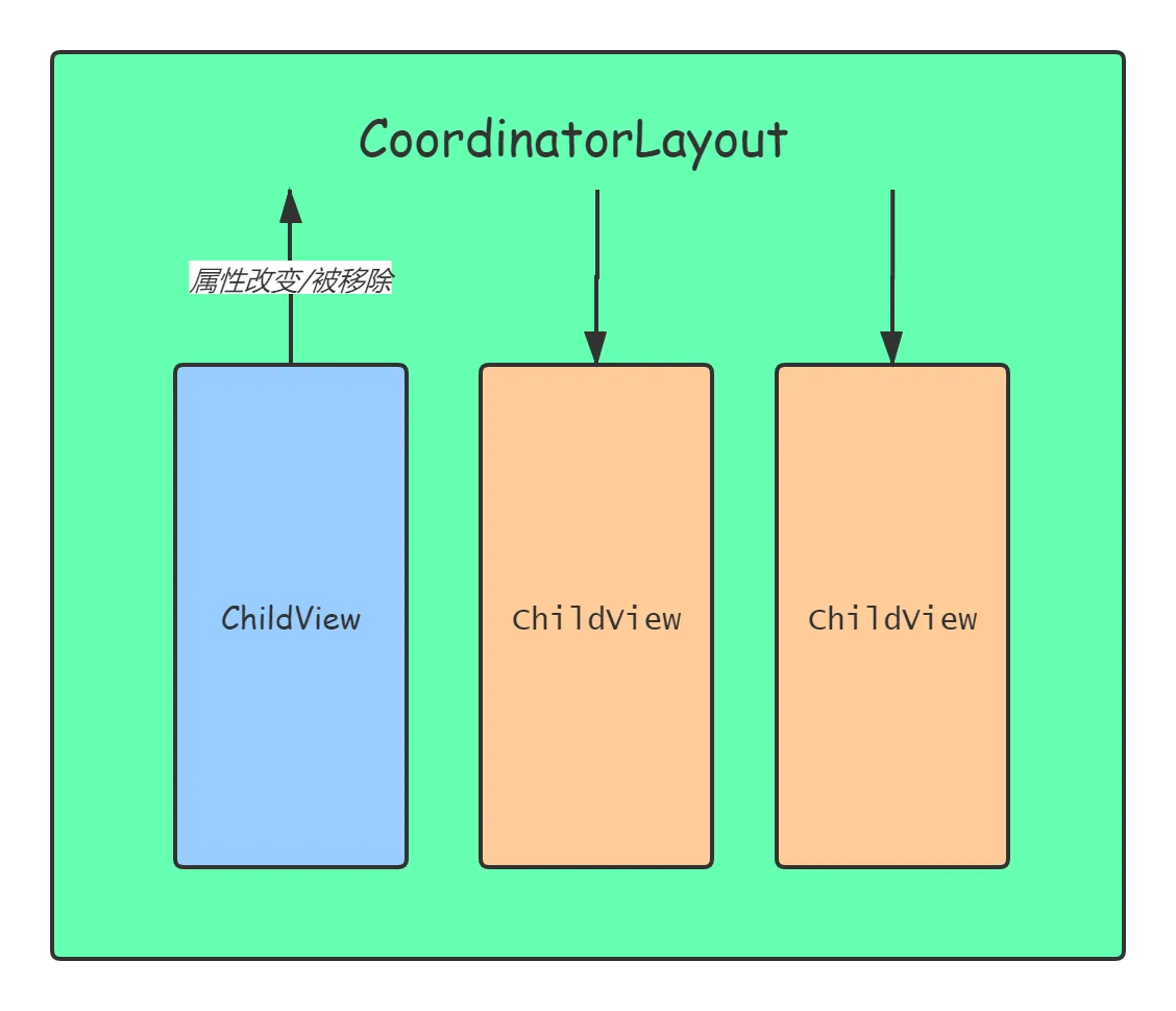 CoordinatorLayout 类似于网游的中央服务器。对于嵌套滑动来说,它实现了 NestedScrollingParent 接口因此可以接受到子 View 的滑动信息,并且分发给所有子 View 的 Behavior 并将它们的响应汇总起来返回给滑动 View。对于依赖其他 View 的功能,当有 View 属性发生改变时它会通知所有声明了监听的子 View 的 Behavior.