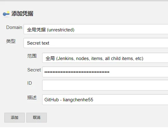 复制一下生成的 Token 回到 Jenkins 添加凭据,类型选 Secret text,将 Token 粘贴到 Secret 编辑框内,ID 留空,描述 自己填一下其他保持默认。