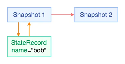 如图,Record name 与 Snapshot1 对应。Snapshot2 基于 S1。虽然 S2 没有与 name 直接对应,但 S2 中如果取值依然可以获取到 “bob”,这是因为 Snapshot1 对 Snapshot2 来说是有效的。