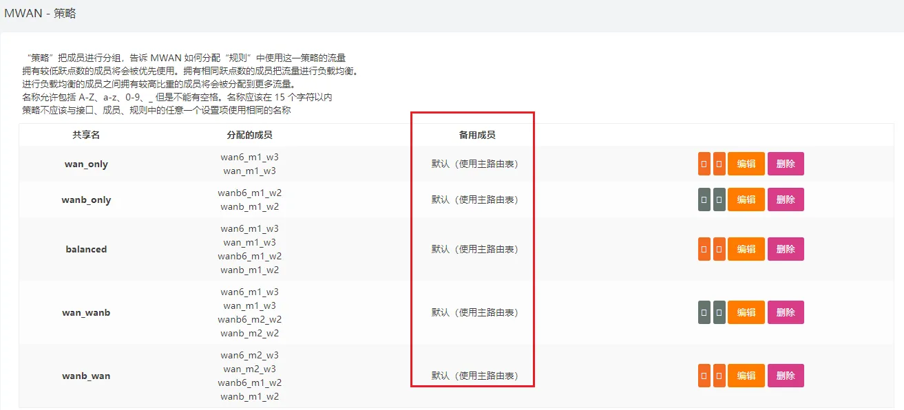 在 网络-负载均衡-策略,将所有条目的 备用成员 修改为 默认(使用主路由表)。