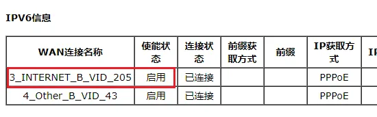 首先得确认光猫启用了 IPv6。一般来说电信应该远程下发配置支持 v6 了,登录光猫后台,进入 状态-网络侧信息,查看 INTERNET 的 IPv6 是否启用就行了。