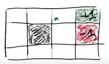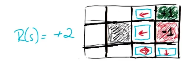 当空白格子奖励为-2,为了最大化长期期望奖励,智能体应该尽快结束游戏。基于此可得上图策略。 需要注意,第(3,1)格不可以向上。若向上则有10%概率向左,距离结束位置更远。