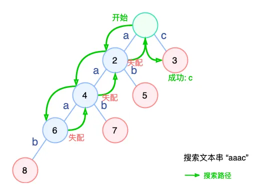 可以看到,为了搜索潜在的模式串 aaab 我们一直搜索到 6 号节点,然后一步步失败,直到根节点,然后才重新匹配到了 c,要是可以一步到位就好了。
