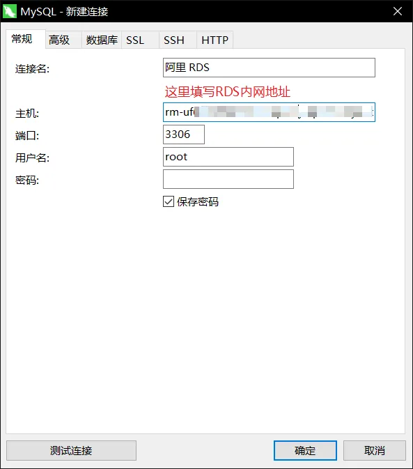 然后切换回常规选项卡,填写数据库的相关属性。主机直接填写 RDS 的内网地址即可。配置好之后点击测试连接,成功就可以啦。